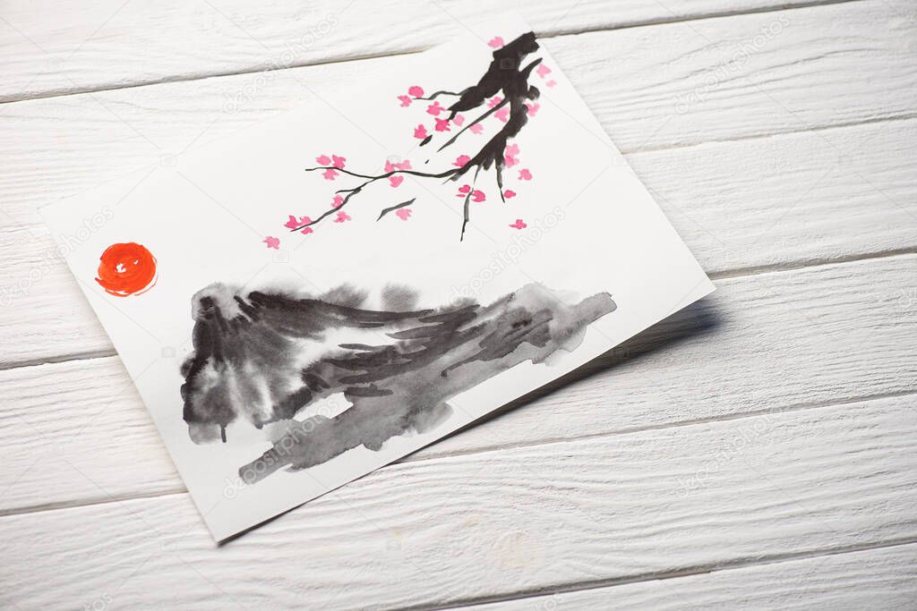Высокий угол обзора бумаги с японской живописью с солнцем, ветками Сакуры и серым холмом на деревянном фоне