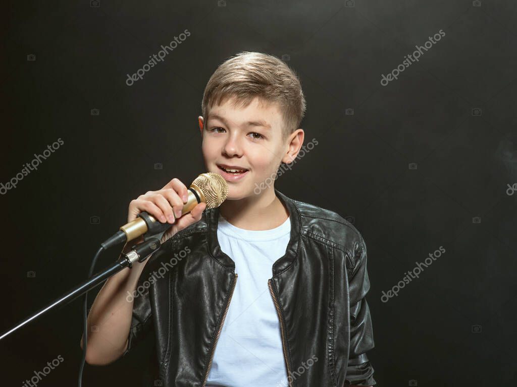- Портрет кавказского подростка в белой футболке, синих джинсах и кожаной куртке с микрофоном, поющим на темном фоне. Хобби и слава