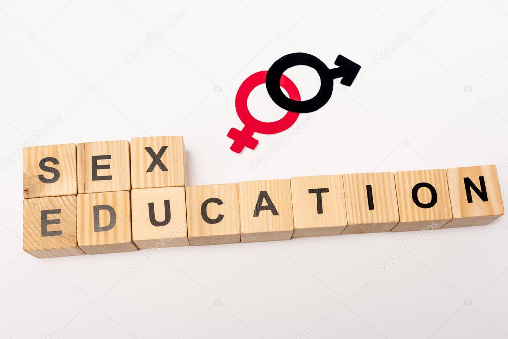 вид на деревянные кубики с половым воспитанием и гендерные символы, выделенные на белом