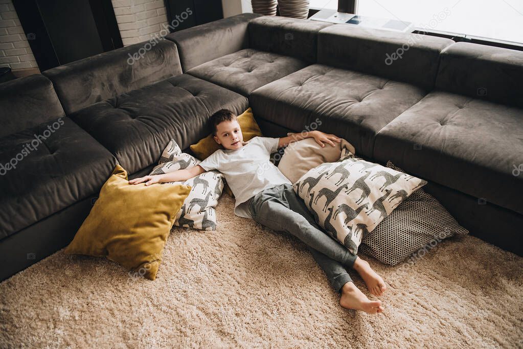 - Семья в большом доме. Уют домашнего уюта. Дети дома. Дети играют на полу. Текстиль. Мальчик-подросток лежит на полу на подушках. Коричневый диван, желтые подушки .