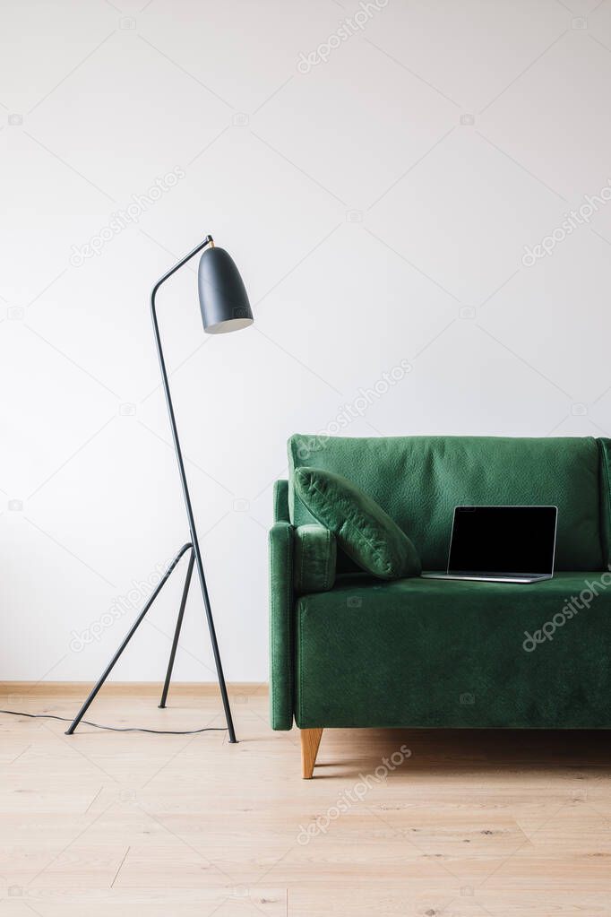 Зеленый диван с подушкой и ноутбуком с чистым экраном рядом с металлической современной лампой