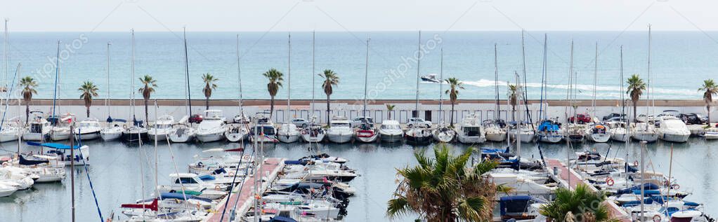 - Каталония, Испания - 30 апреля 2020 года: пальмы возле яхт в порту с морским пейзажем на заднем плане, панорамный снимок