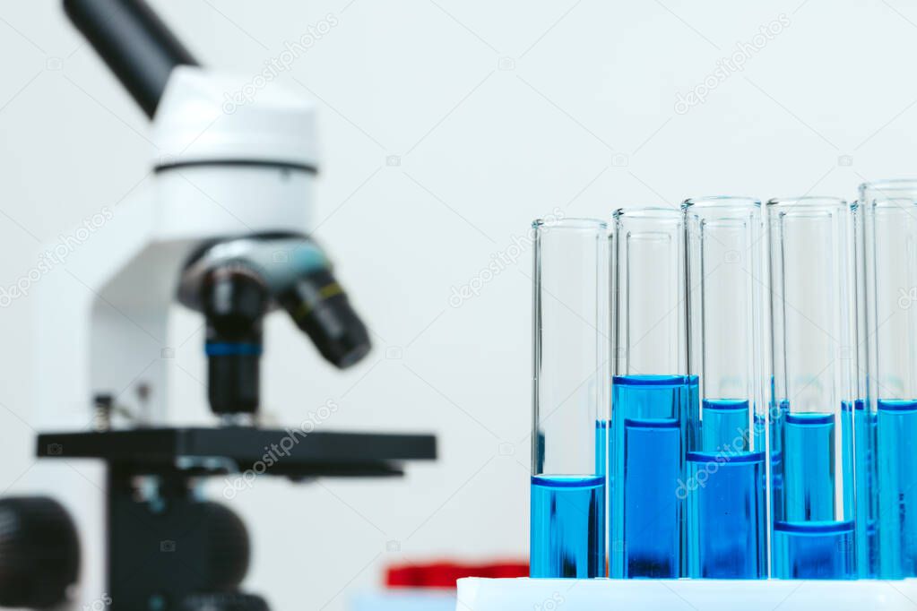 Микроскоп и пробирки на столе в лаборатории, закрыть