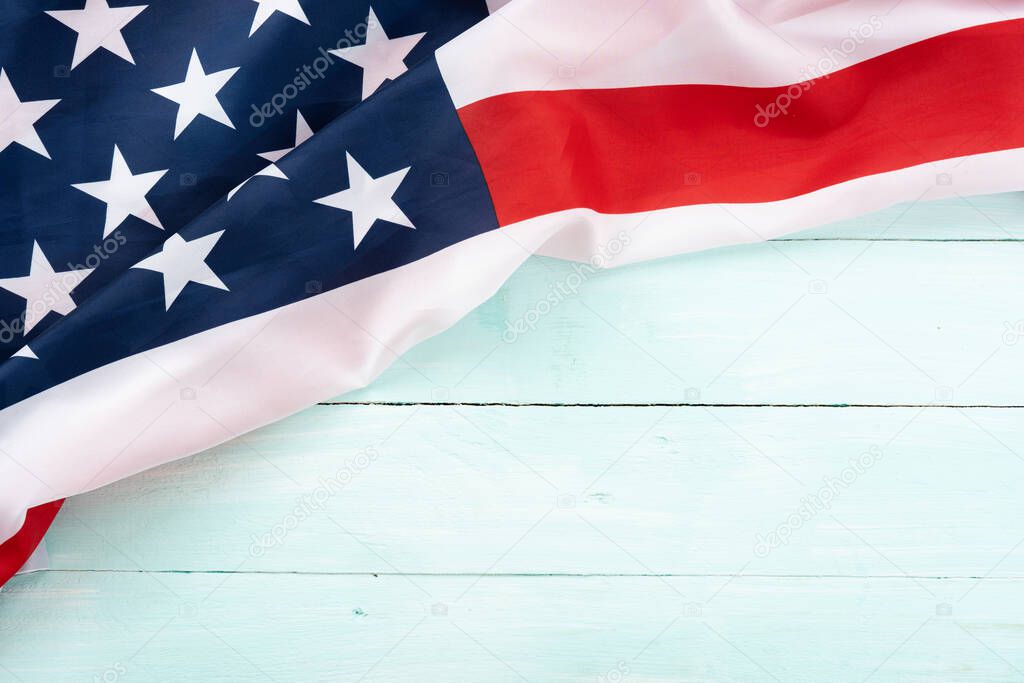 - Американский флаг на синем деревянном фоне. Празднование Дня памяти президента США, Дня ветеранов, Дня труда, Независимости или 4 июля. Вид сверху, пространство для копирования текста .
