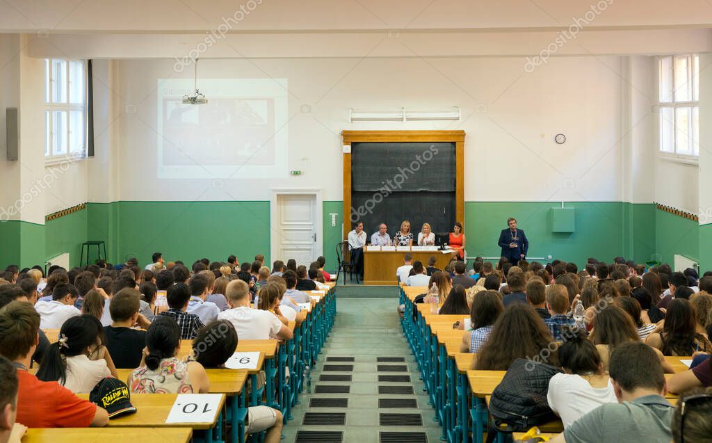 БУДАПЕСТ, ХАНГАРИЯ - 02 сентября 2015 года: Неизвестные студенты в аудитории ELTE в Будапеште. Университет им. Эотвоса Лоранда (ELTE) является крупнейшим и старейшим университетом Венгрии