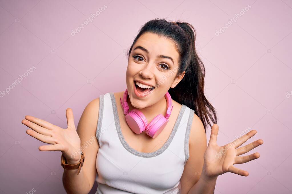 - Молодая брюнетка фитнес-женщина в спортивных наушниках на розовом изолированном фоне празднует сумасшедший и поражен успехом с поднятыми руками и открытыми глазами, крича взволнованно. Концепция победителя