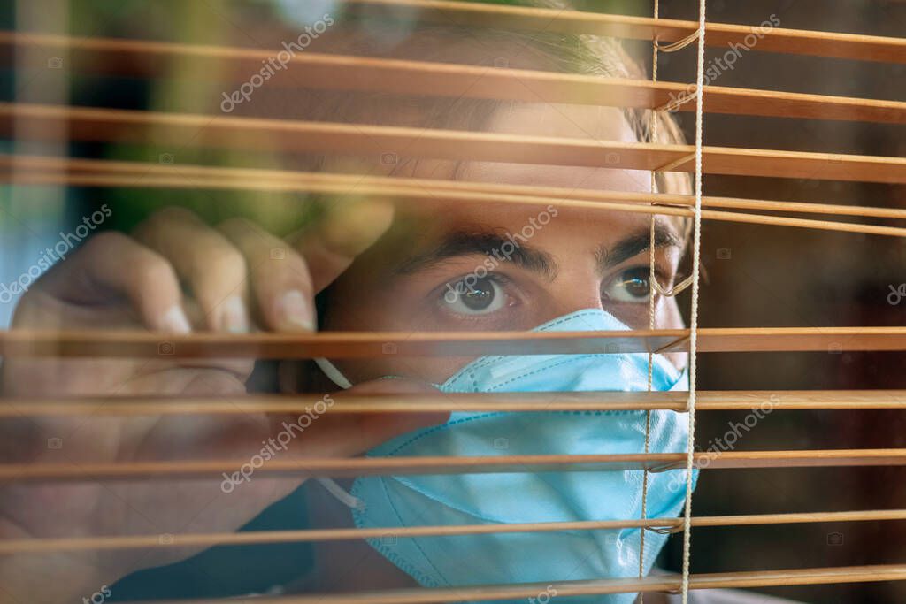 Одинокий мужчина в медицинской маске смотрит в окно. Изоляция дома для самокарантина. Концепция домашнего карантина, профилактика COVID-19. Ситуация со вспышкой коронавируса