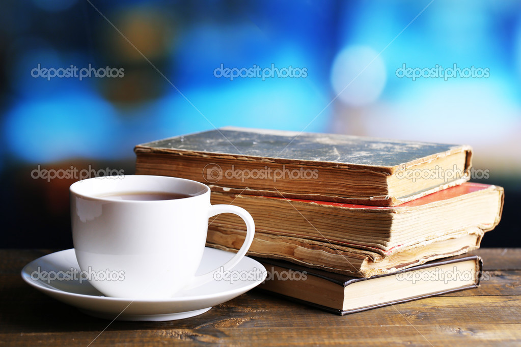 - Чашка горячего чая с книгами на столе на ярком фоне