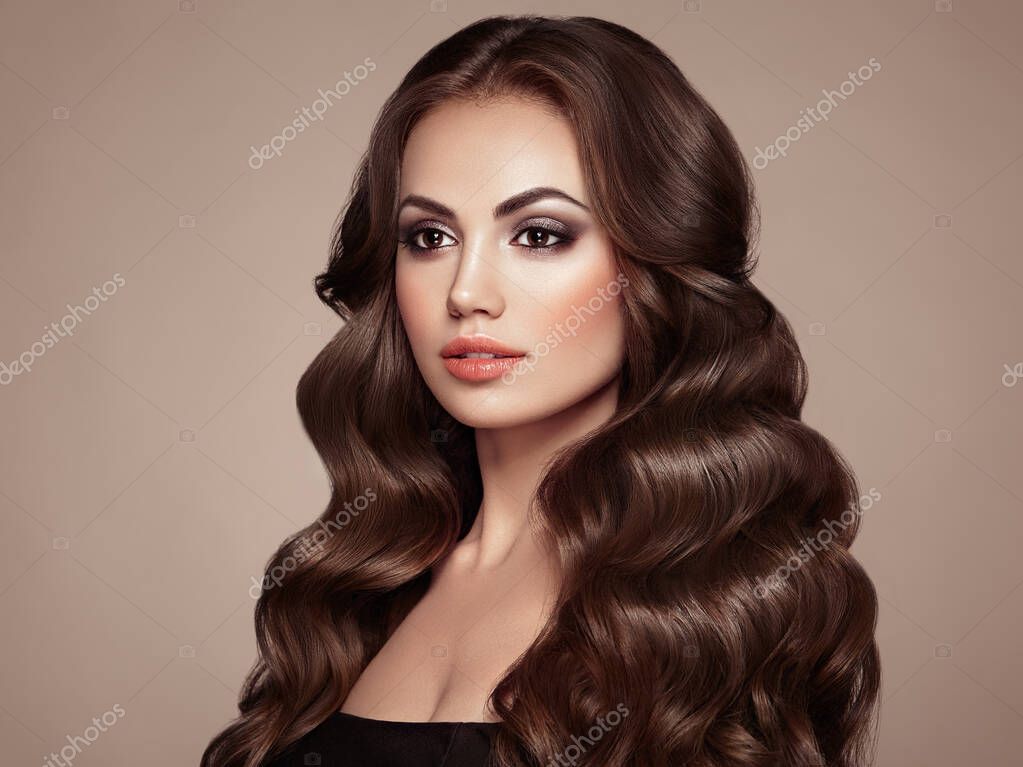 - Брюнетка с длинными здоровыми и блестящими вьющимися волосами. Уход и красота. Образцовая женщина с волнистым хайрстиком. Макияж и ювелирные изделия