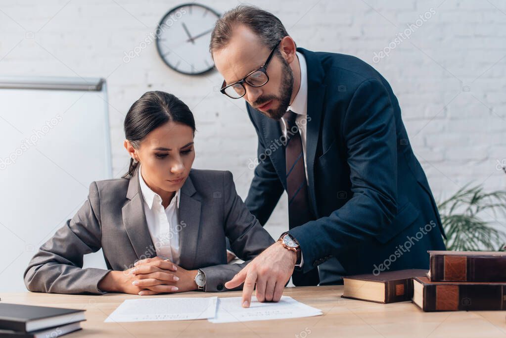 Избирательный фокус юриста, указывающего пальцем на документы и деловую женщину