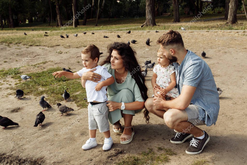 - Счастливая молодая семья с детьми отдыхает в парке у пруда