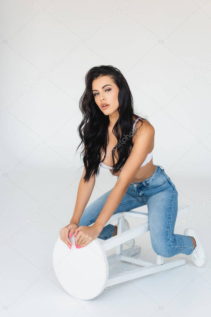Сексуальная брюнетка в джинсах и лифчике сидящая и трогательная табуретка на сером