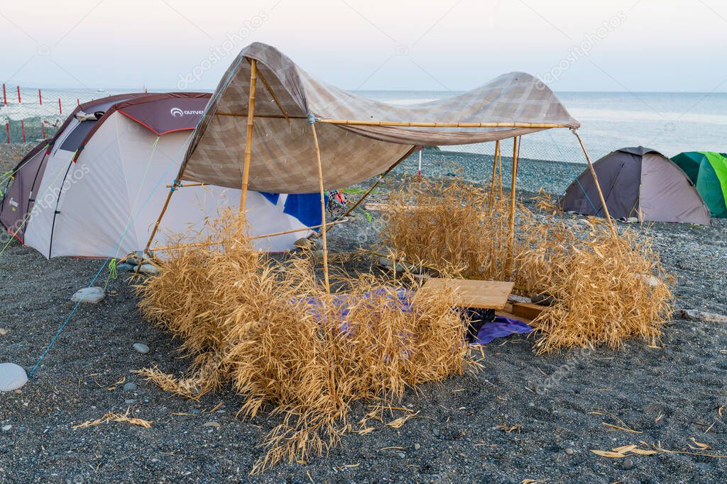 - Пляжные палатки на пляже с песком и камнями, деревянный стол