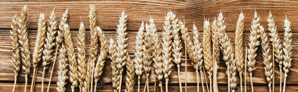 вид сверху на колосья пшеницы на деревянном фоне, панорамный снимок
