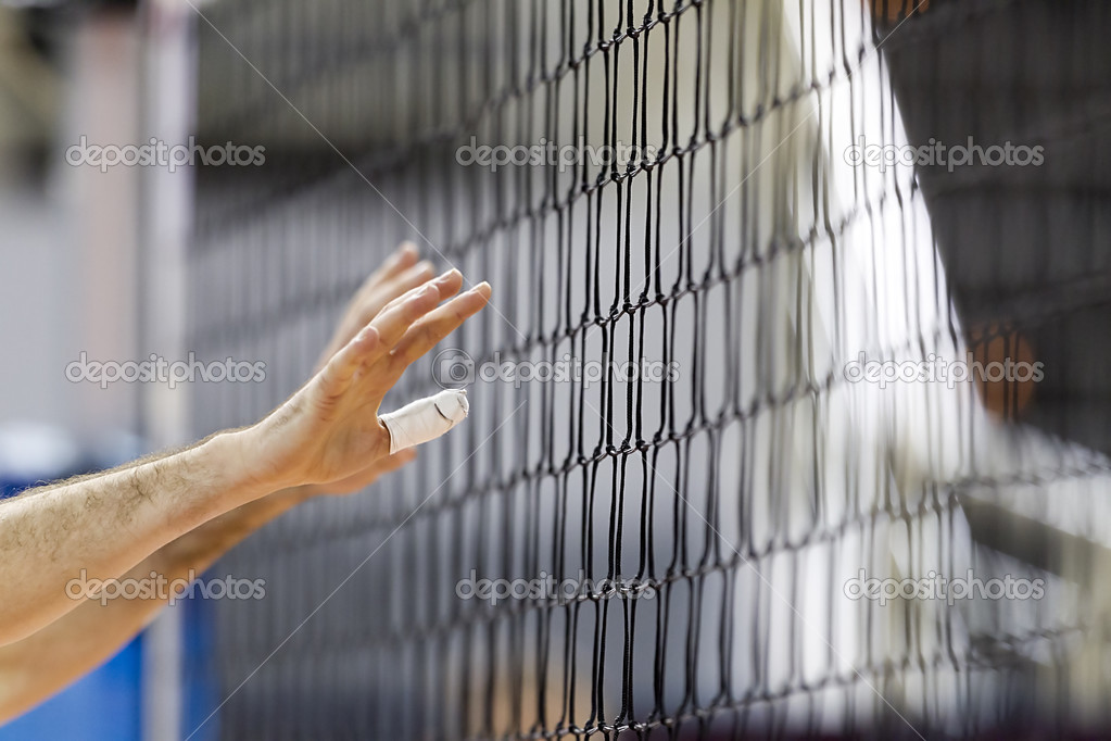 ФЕССАЛОНИКИ, Греция - 15 февраля 2014 года: руки на сетке во время игры Греческой волейбольной лиги Паок vs Олимпиакос на ПАОК спортивной арене. Shallow dof