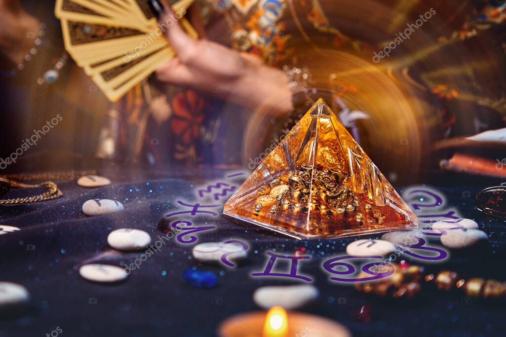 Волшебное гадание и эзотерика. Волшебная стеклянная пирамида с волшебным свечением. На заднем плане гадалка держит фаната карт Таро. Крупный план рук.