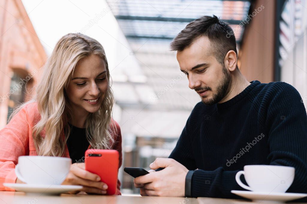 - Улыбающиеся кавказские коллеги-женщины и мужчины делятся медиа-контентом и файлами на смартфоне через 4G связь отдыхая с педиками в кафе, веселые молодая женщина и мужчина ищут информацию в Интернете
