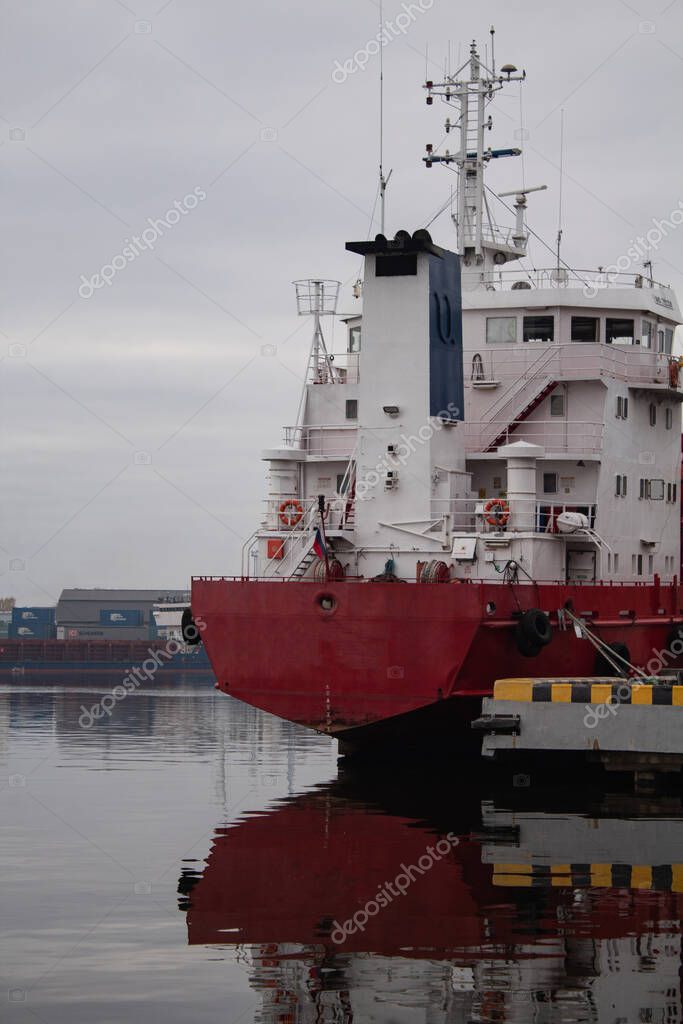 Ранним утром у берега на набережной Калининграда стоит белый корабль с красной палубой