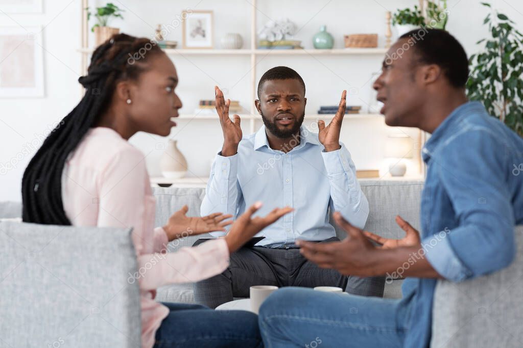 - Раздражённый чёрный психолог наблюдает, как пара спорит во время сеанса супружеской терапии