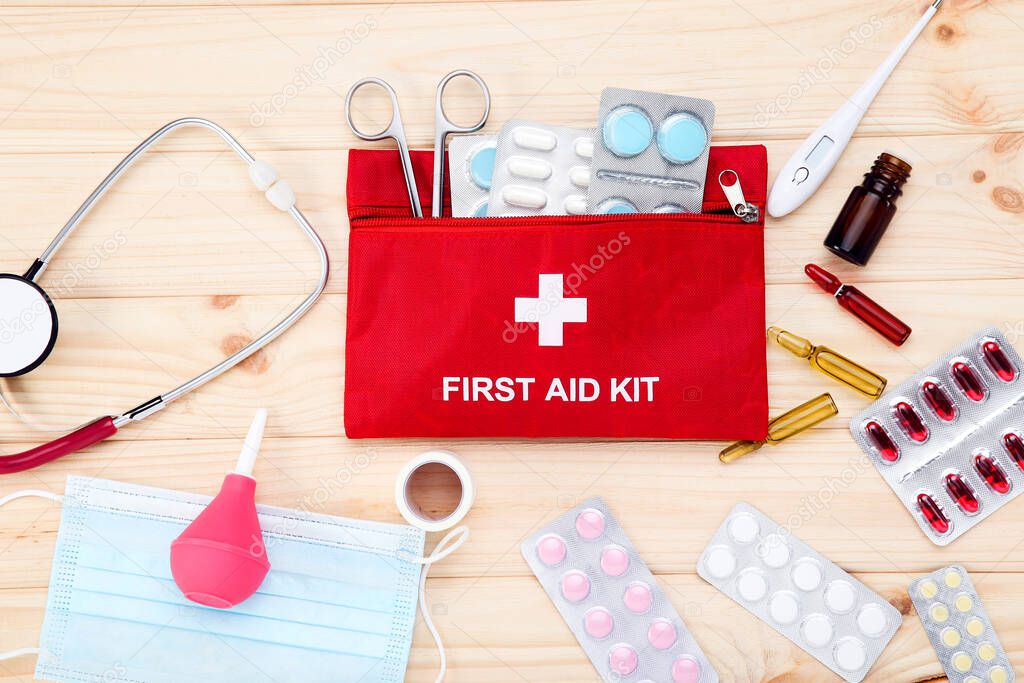 - Комплект первой помощи с медикаментами на коричневом деревянном столе