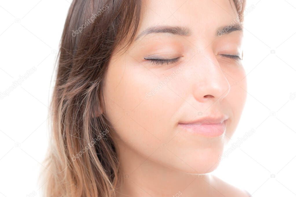 Портрет молодой красивой брюнетки с закрытыми глазами на белом фоне