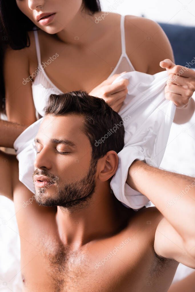сексуальная женщина раздетая чувственный мужчина с закрытыми глазами в футболке в помещении