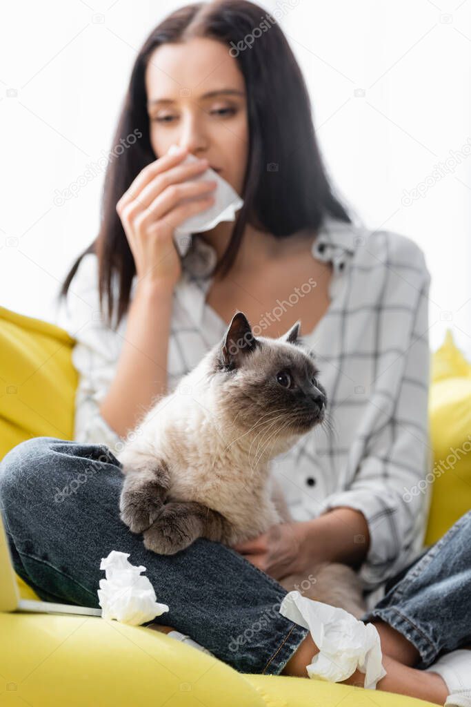 Селективный фокус кошки возле аллергической женщины, вытирающей нос бумажной салфеткой на размытом фоне
