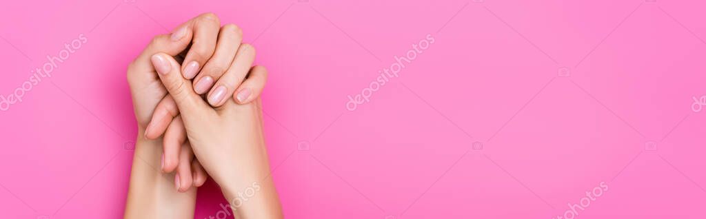 верхний вид женских рук с пастельным маникюром на розовом фоне, баннер