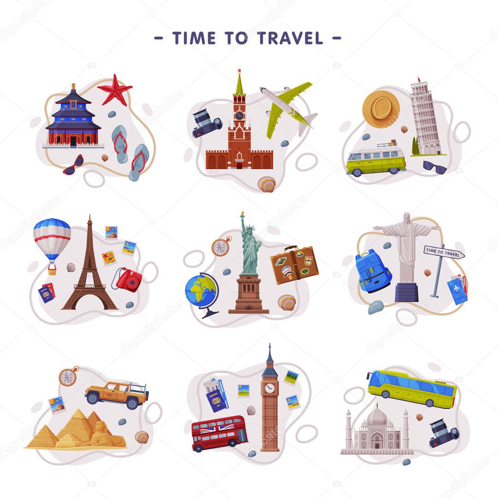 Набор векторных композиций "Путешествия и туризм" с городской достопримечательностью и разбросанными символами путешествия