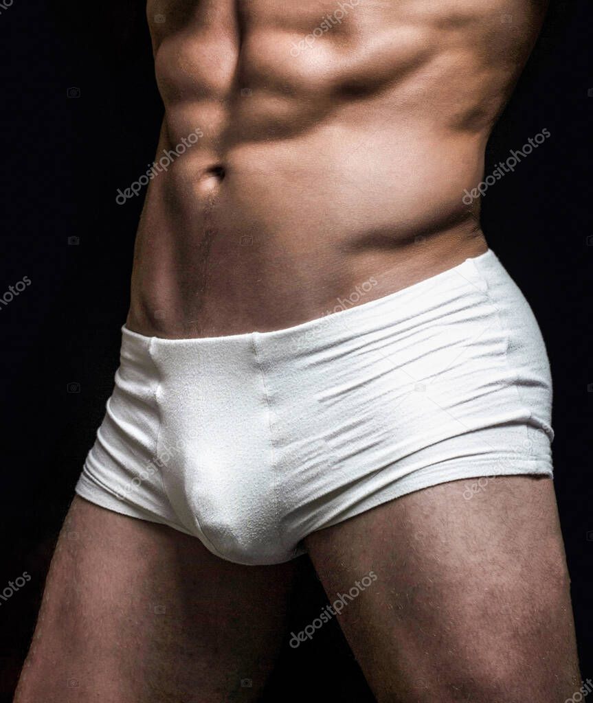 Человек в белых шортах. Красивый мускулистый мачо в белых трусах.