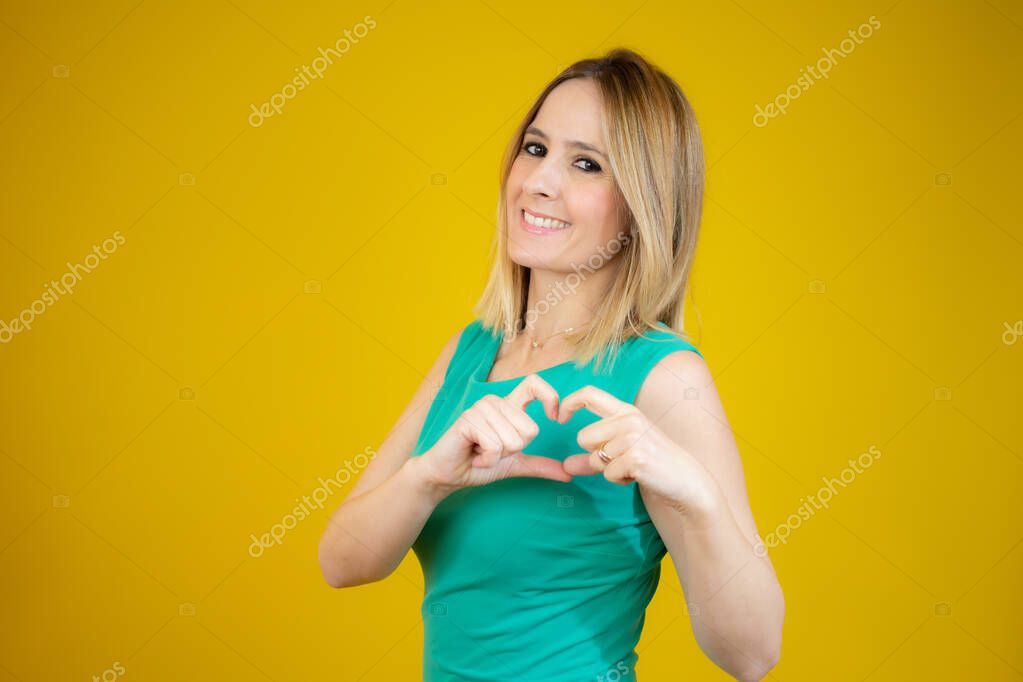 Красивая женщина показывает сердце фигуры с пальцами и улыбается в камеру на желтом фоне
