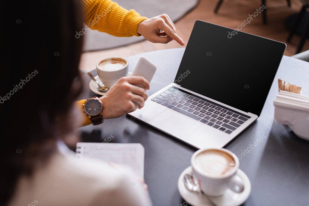 Человек со смартфоном указывает на ноутбук с пустым экраном рядом с кофе и друг на размытом переднем плане в ресторане