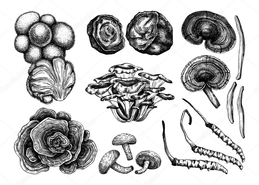 Коллекция иллюстраций к лекарственным грибам. Адаптогенные наброски растений. Идеально подходит для рецепта, меню, этикетка, значок, упаковка, Ручной набросок грибов контуры. Ботаническое множество