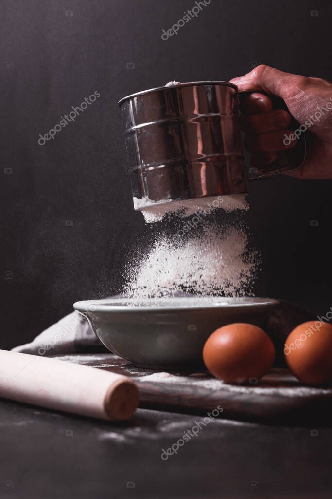 - Рука держит металлический просеиватель муки, решето, посыпанное мукой. Просеиваю муку. Подготовка к выпечке. Низкий ключ фото