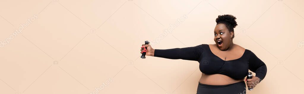 изумленный африканский американец плюс размер женщины в спортивной одежде держа гантели изолированы на бежевый, баннер