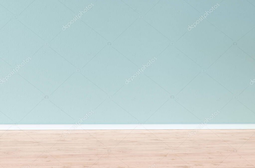 - Светло-голубая текстурированная стена и деревянный пол в пустом помещении для хранения товара, свет, проходящий через окно. 3D иллюстрация.