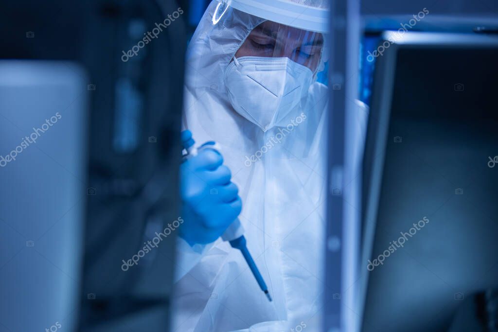 Профессиональный врач в защитном костюме проводит научные эксперименты и разрабатывает вакцину в современной лаборатории. Рабочее место инженеров-генетиков. Концепция науки и медицины.