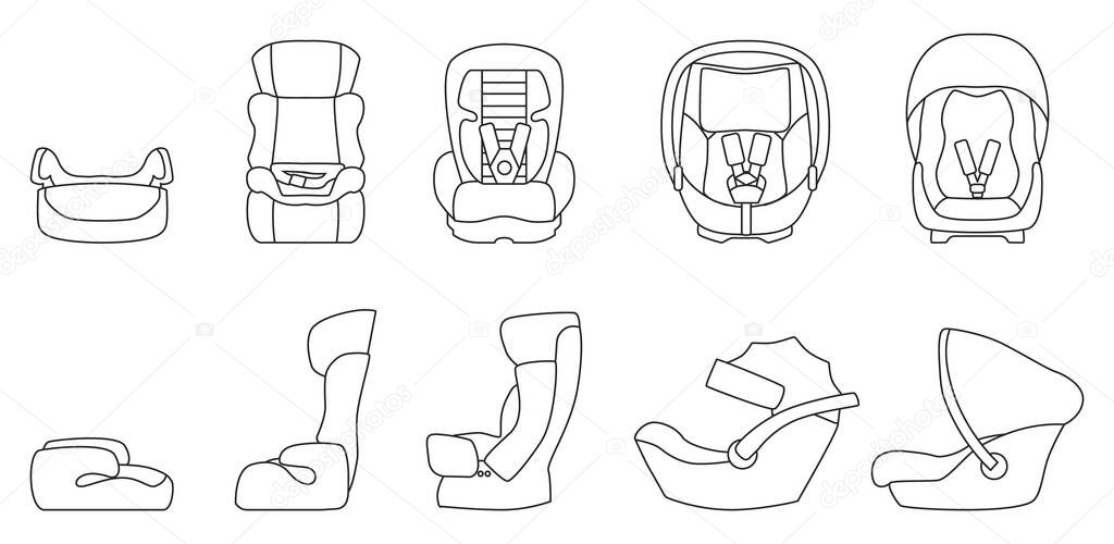 Значок векторного контура детского автокресла. Векторное иллюстрационное кресло на белом фоне. Изолированный набор контуров иконки детское автокресло.