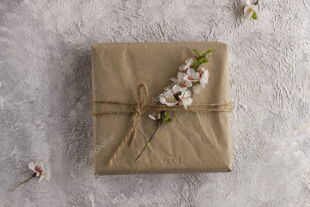 - Подарочная коробка с веткой цветущей сакуры на светлом столе. Плоский лежал