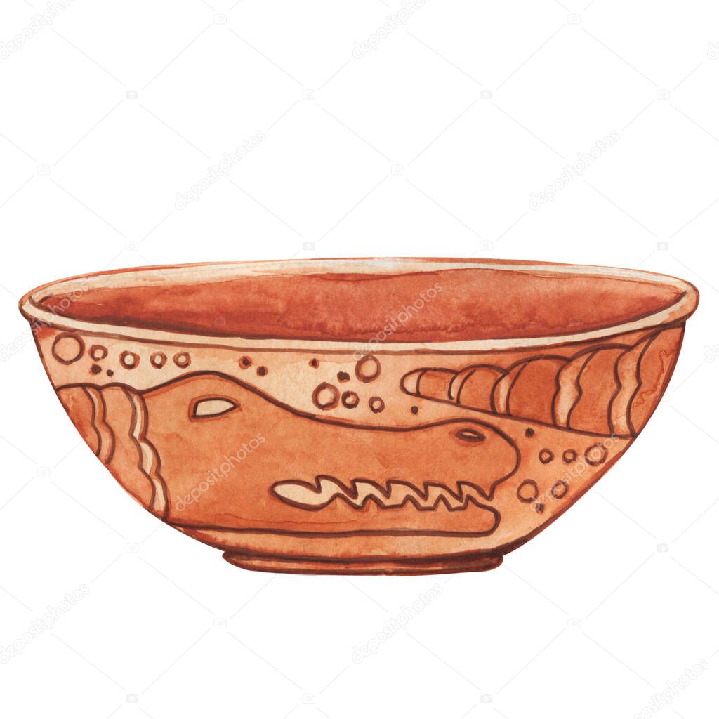 - Керамический глиняный горшок, чаша с винтажным рисунком. Винтажный рисунок пещерного человека с животным крокодилом. Ручной рисунок акварелью на белом фоне
