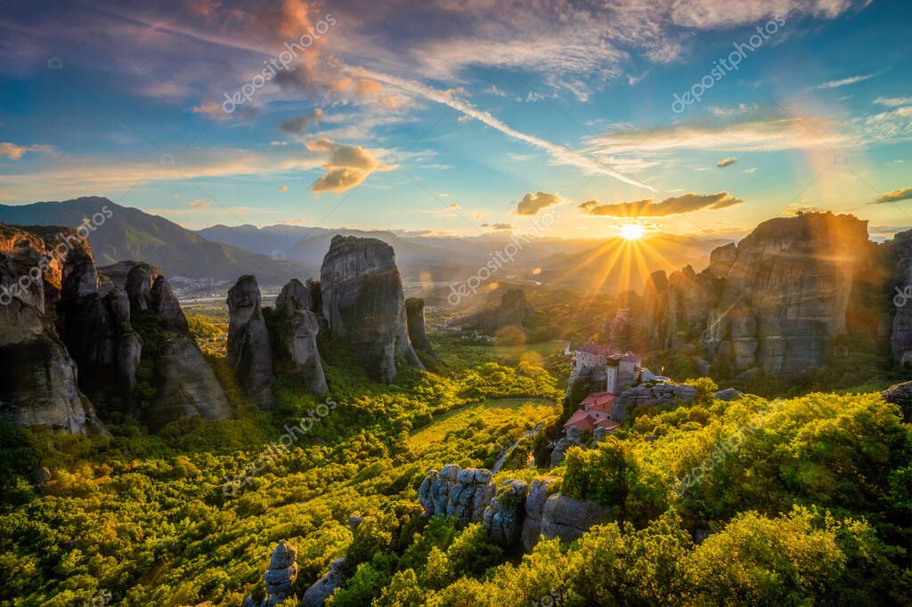 Закат над монастырем Русану и монастырем Св. Николая Анапавса в знаменитом греческом туристическом центре Метеора в Греции на закате солнца лучи и блики объектива