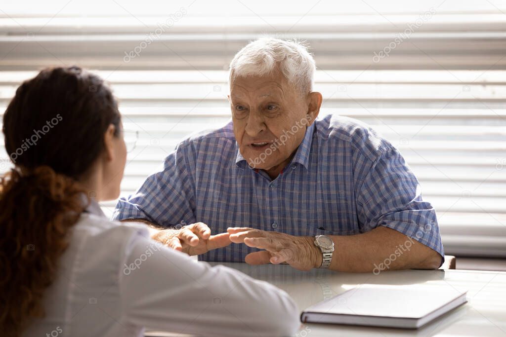 Проблемы со здоровьем на пенсии. Старик-пенсионер сидит за столом в смотровой и жалуется на плохое здоровье, описывая тревожные симптомы. Пациент старшего возраста встретится с терапевтом для получения медицинской консультации