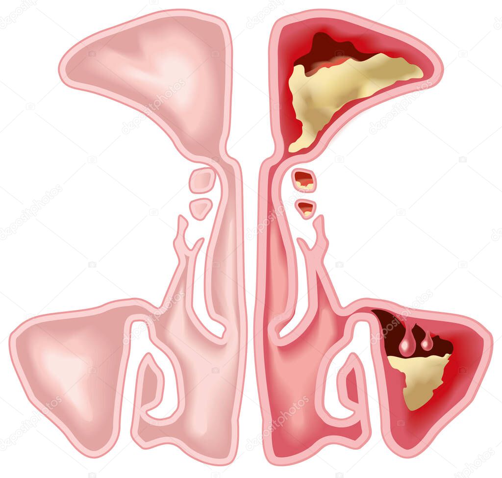 - Здоровые пазухи и синусит с воспаленной подкладкой, затрудненное отверстие пазухи, аденоидная и избыточная слизь