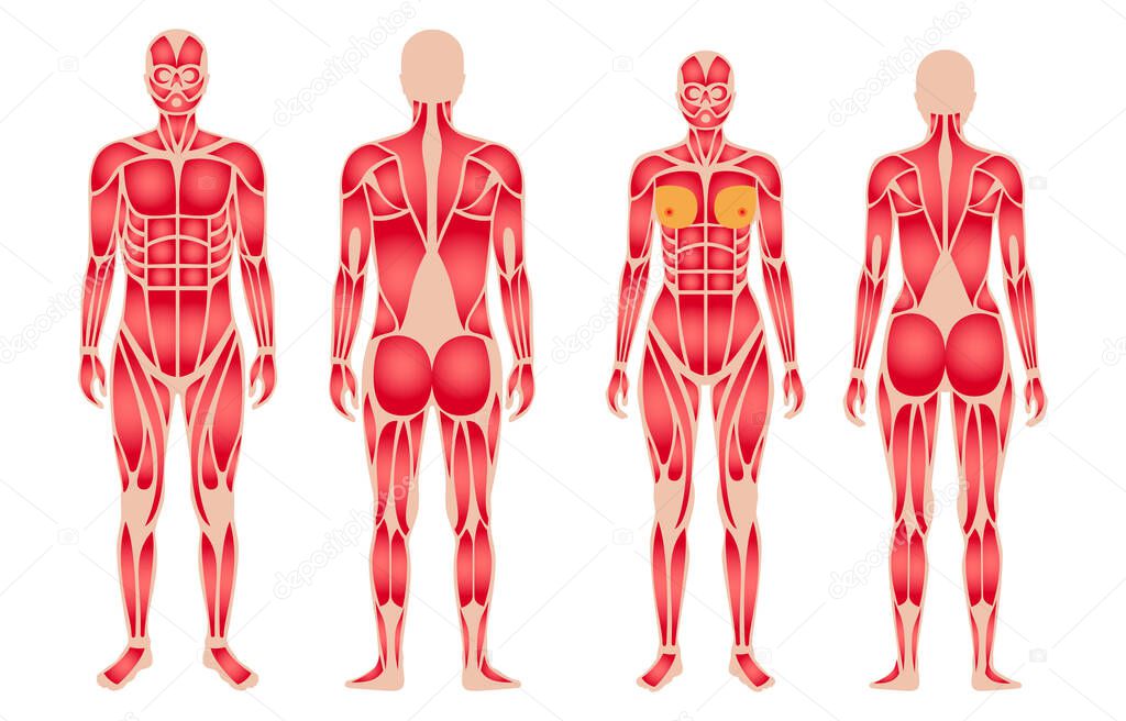 Анатомический плакат мышечной системы человека. Структура мышечных групп мужчин и женщин в сравнении с фронтальным и задним видом. Построение, фитнес, сильная концепция тела. Изолированная плоская векторная иллюстрация