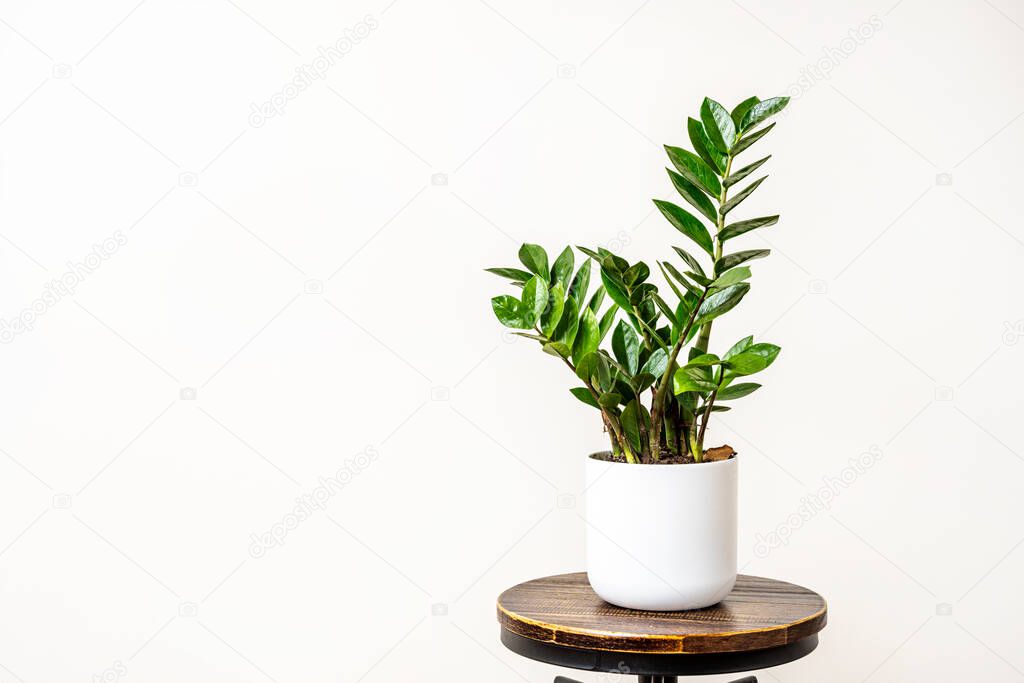 Замиокулька в белом горшке на темном дереве и черный металл промышленного стула