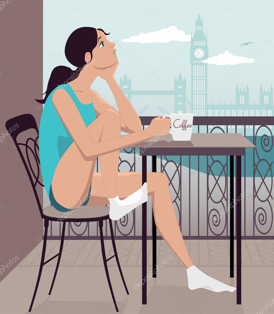 Молодая девушка завтракает на балконе отеля в Лондоне, векторная иллюстрация