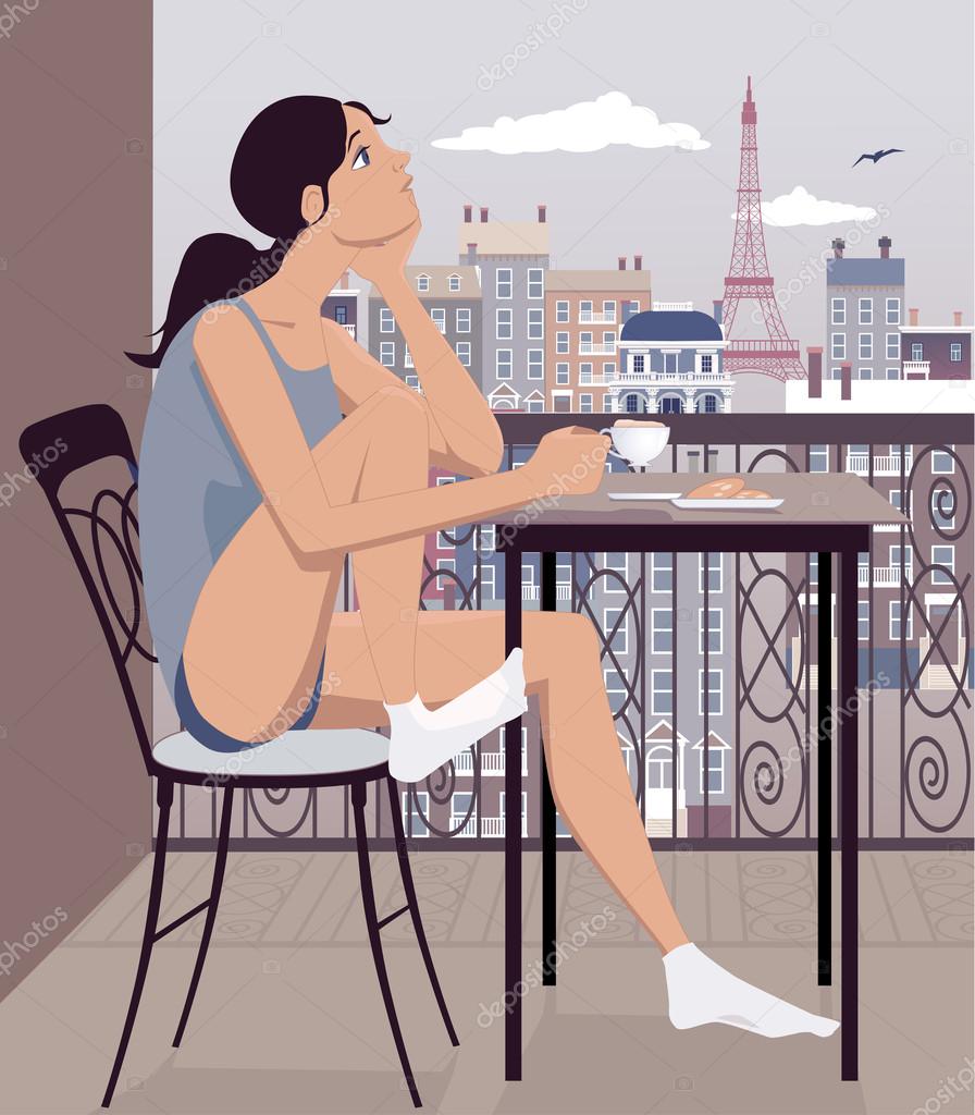 Молодая девушка пьет кофе и печенье на балконе, смотрит на Париж, векторная иллюстрация