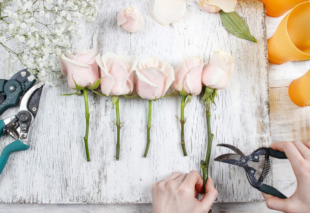- Флорист на работе. Женщина делает букет из розовых роз