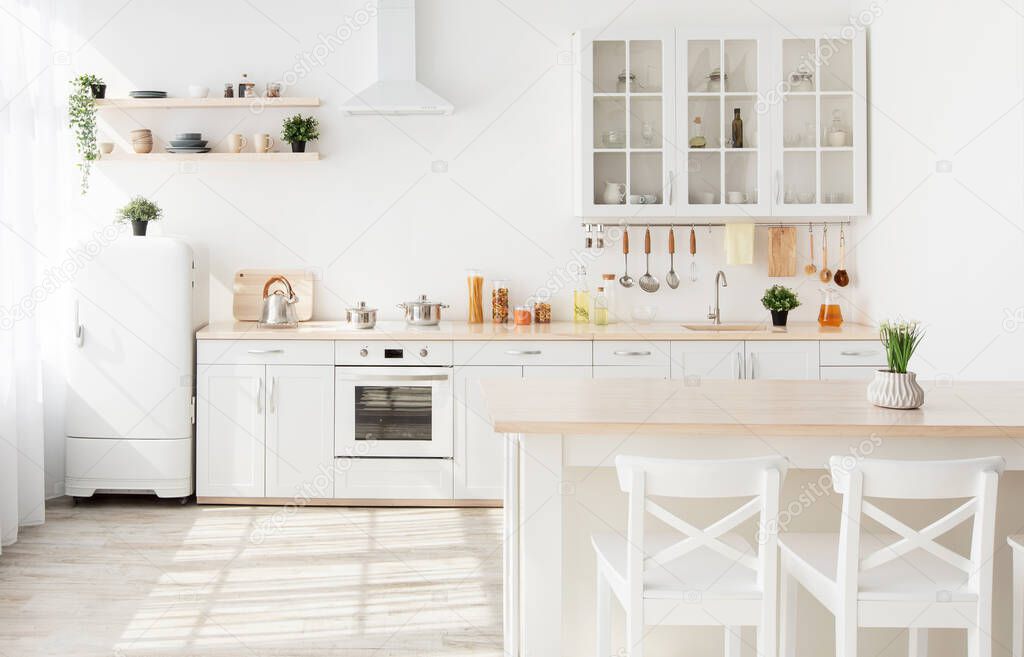- Легкая кухонная мебель после ремонта. Кухонные принадлежности и растения на полках, стульях и столе в скандинавском стиле