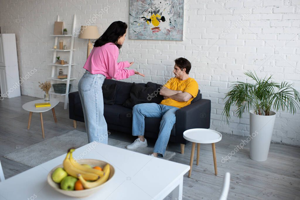 Злая молодая женщина кричит с протянутыми руками рядом с парнем, сидящим на диване со скрещенными руками в гостиной